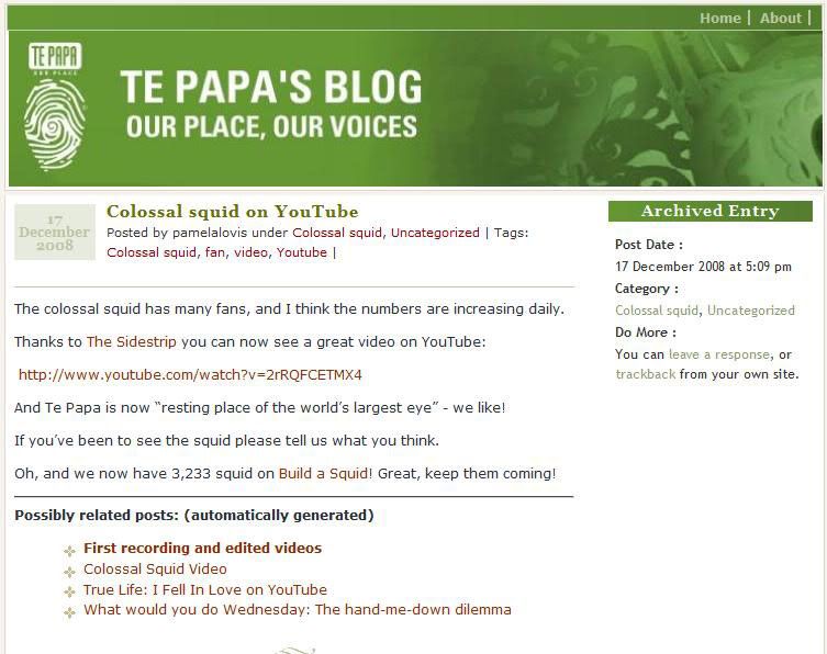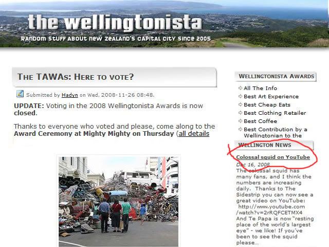 Thank you very much to Te Papa Museum for featuring my video blog "The Sidestrip" regarding the Colossal Squid story that I made during the public opening of Colossal Squid Exhibit last Saturday ,Dec 13,2008.