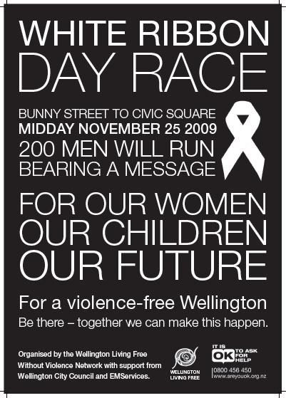 If you're in Wellington today, Why not join the Living Free Without Violence Network White Ribbon Day race through the streets of Wellington at lunch time from Bunny Street up to Civice Square